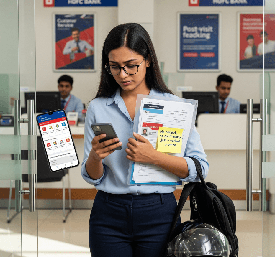 HDFC branches manage 100M+ annual visits, but the experience is plagued by overcrowding and manual verification.