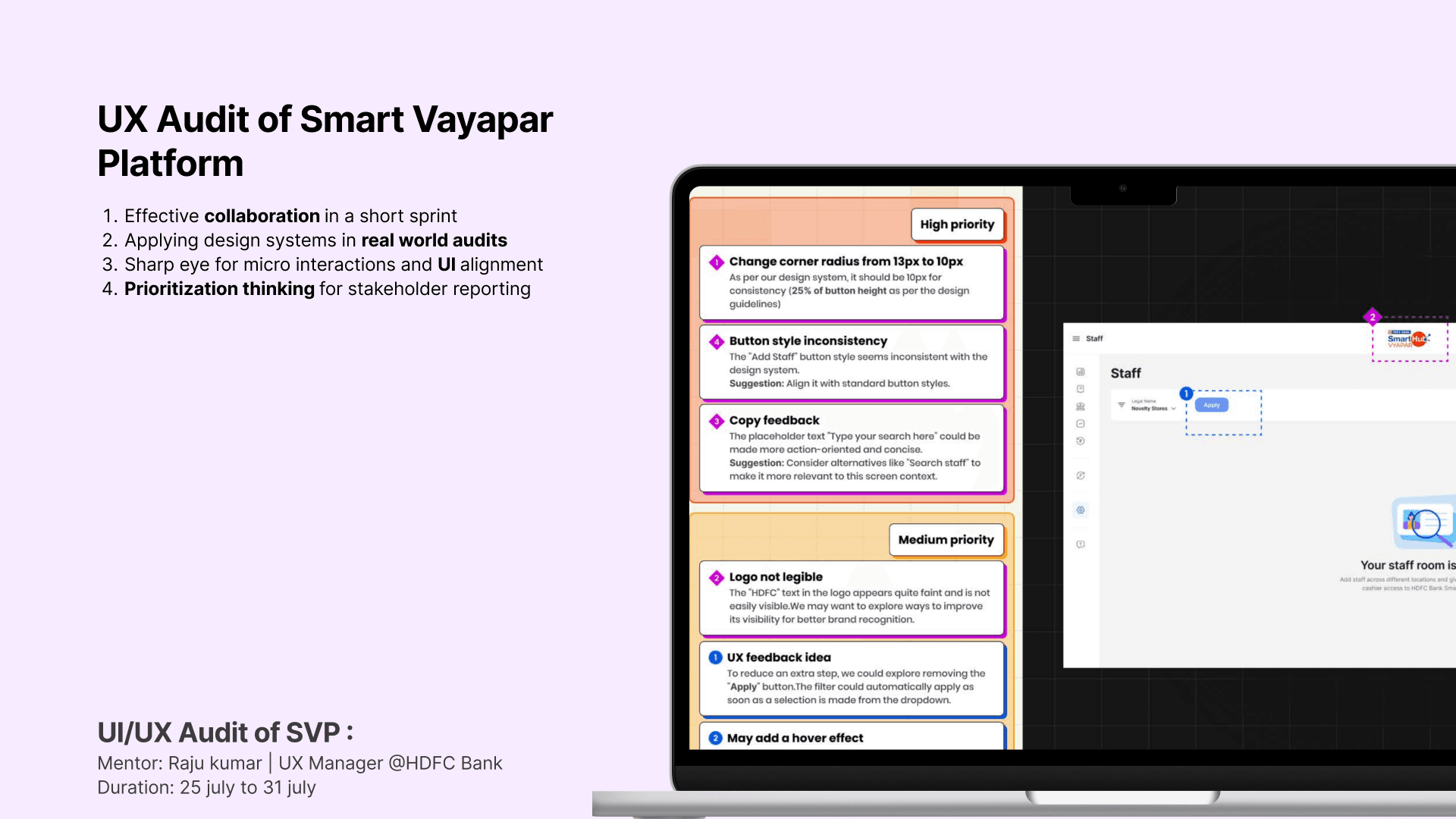 This project involved a heuristic evaluation of the smart Vayapar platform.